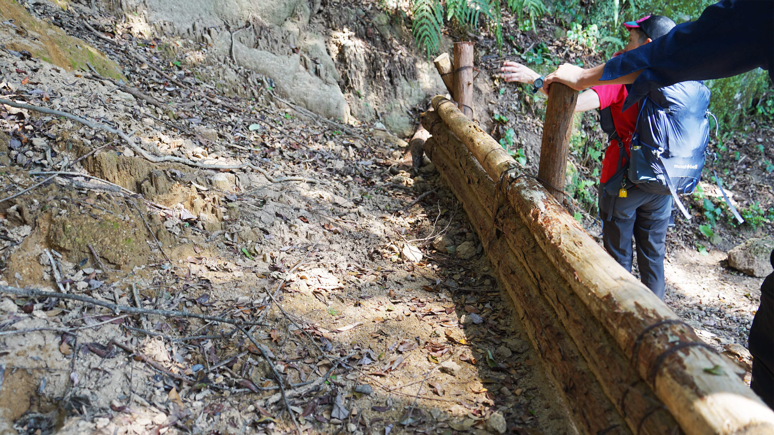 険しい斜面や崩れやすい場所を確認しながら、ロープを張ったり、倒木を片づけたり。